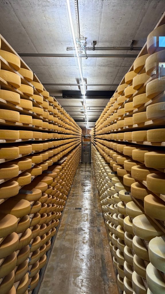 Then we made our way to La Maison De Gruyère for a tour guiding us through the cheese making process. We were given a headset with audio detailing the history and facts about how cheese is made. They also gave us a packet of three cheeses (6 months, 9 months, and 12 months old) to test taste as we made our way through the establishment. The flavors ranging from 6 to 12 months old were shockingly different, and demonstrated how much aging the cheese truly affects the taste. We’ve included a taste testing video in our fun stuff section for anyone interested in our cheese tasting review! After walking through hallways with pictures of the cows, plants local to the area, and different instruments used to make cheese, we entered a room with big glass windows looking in on the cheese making factory.