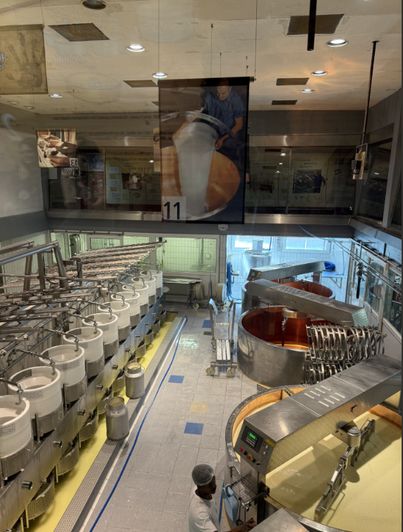 For around an hour we were able to watch the fromagers make the cheese from scratch, starting in entirely liquid form and being put into molds to be aged. It started with the milk mixture (milk, cultures, and rennet added for curdling purposes) being mixed in a huge vat. The curd is heated and cut by long silver knives that go around the entire vat. All of the curd drains from the vats into smaller individual molds that have previously been prepared with casings/moldings. Using what appears to be large dust pans, the fromagers scoop out the foam that has accumulated on the top of the cheese curd after being transported from vat to mold. They are then marked, the rest of the casing is put on top of the cheese, and the entire line of molds flips over to then repeat the process for the second vat. The process was long, with many intricate steps and seemingly large and heavy machinery. I truly had no idea how cheese was made in an industrial setting, so seeing the process up close was definitely an eye opening experience.